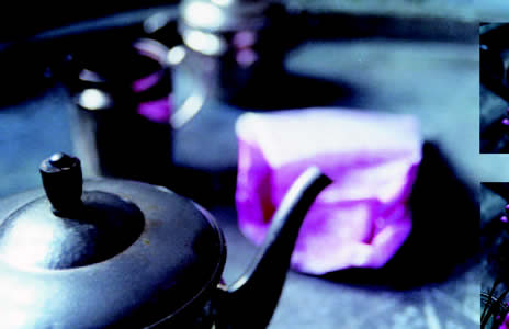 Set mit Hyazinthe, Silbergeschirr und orientalischem Tablett. Fotostyling für eine Broschüre.